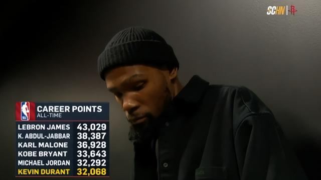 此役后杜兰特完成多项里程碑:1.杜兰特连续三场30+成为火箭队史最年长球员;