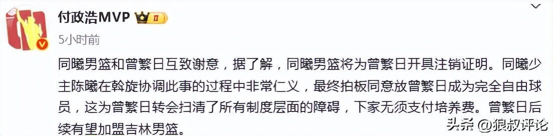 媒体人付政浩发文:同曦男篮和曾繁日互致谢意,据了解,同曦男篮将为曾繁日开具注销证明。