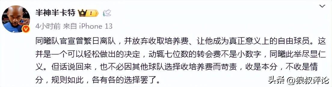 媒体人半神半卡特则是透露出培养费的更多细节:这并不是一个可以轻松做出的决定,动辄七位数的转会费不是小数字,同曦此举尽显仁义。但话说回来,也不必因其他球队选择收培养费而苛责,收是本分,不收是情分,规则如此,各有各的选择罢了。